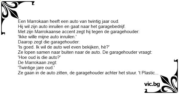 De garagehouder kijkt naar de kilometerteller en stelt verbaasd vast dat er in die twintig jaar maar 500 kilometer op de teller is gekomen. De garagehouder zegt tegen de Marrokaan: