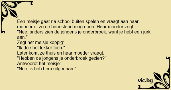 "Nee, anders zien de jongens je onderbroek, want je hebt een jurk aan."