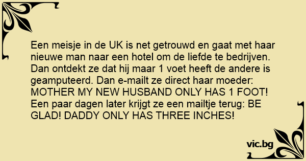 Een meisje in de UK is net getrouwd en gaat met haar nieuwe man naar een hotel om de liefde te bedrijven. Dan ontdekt ze dat hij maar 1 voet heeft de andere is geamputeerd. Dan e-mailt ze direct haar moeder: MOTHER MY NEW HUSBAND ONLY HAS 1 FOOT!