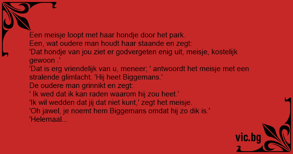 Een meisje loopt met haar hondje door het park. Een, wat oudere man houdt haar staande en zegt: 'Dat hondje van jou ziet er godvergeten enig uit, meisje, kostelijk gewoon .' 'Dat is erg vriendelijk van u, meneer; ' antwoordt het meisje met een stralende glimlacht. 'Hij heet Biggemans.' De oudere man grinnikt en zegt: ' Ik wed dat ik kan raden waarom hij zou heet.' 'Ik wil wedden dat jij dat niet кunт,' zegt het meisje. 'Oh jawel, je noemt hem Biggemans omdat hij zo dik is.' 'Helemaal niet,' roept het meisje, 'Wij noemen hem Biggemans omdat hij altijd met de zeug op de kinderboerderij neukt.'