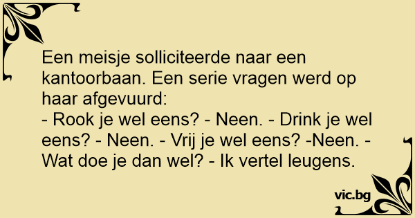 - Rook je wel eens? - Neen. - Drink je wel eens? - Neen. - Vrij je wel eens? -Neen. - Wat doe je dan wel? - Ik vertel leugens.