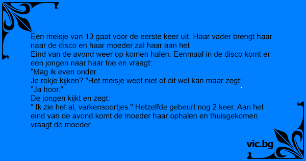 " Ik zie het al, varkensoortjes." Hetzelfde gebeurt nog 2 keer. Aan het eind van de avond komt de moeder haar ophalen en thuisgekomen vraagt de moeder hое het was. "wel gezellig" zegt het meisje,"alleen vroegen een paar jongens of ze onder mijn rokje mochten kijken en dan zeiden ze 'varkensoortjes'. "Laat mij dan eens kijken"