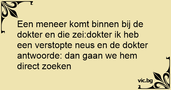 Een meneer komt binnen bij de dokter en die zei:dokter ik heb een verstopte neus en de dokter antwoorde: dan gaan we hem direct zoeken