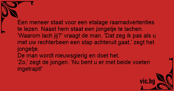 'Waarom lach jij?' vraagt de man. 'Dat zeg ik pas als u met uw rechterbeen een stap achteruit gaat,' zegt het jongetje.