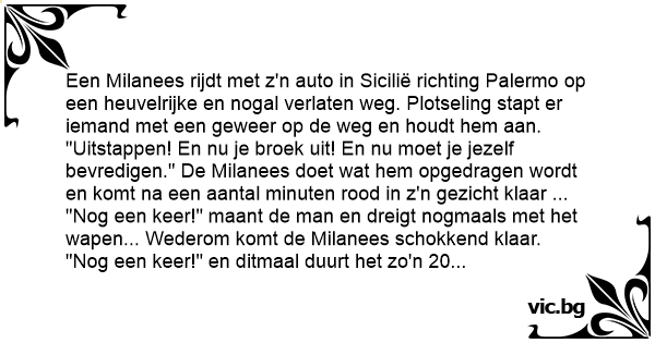 "Uitstappen! En nu je broek uit! En nu moet je jezelf bevredigen." De Milanees doet wat hem opgedragen wordt en komt na een aantal minuten rood in z'n gezicht klaar ...