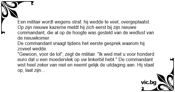 "Gewoon, voor de lol", zegt de militair. "Ik wed met u voor honderd euro dat u een moedervlek op uw linkerbil hebt." De commandant wist heel zeker van niet en neemt gelijk de uitdaging aan. Hij staat op, laat zijn broek zakken, en inderdaad, geen vlekje te zien.
