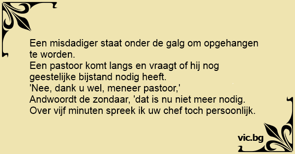 Een pastoor komt langs en vraagt of hij nog geestelijke bijstand nodig heeft.