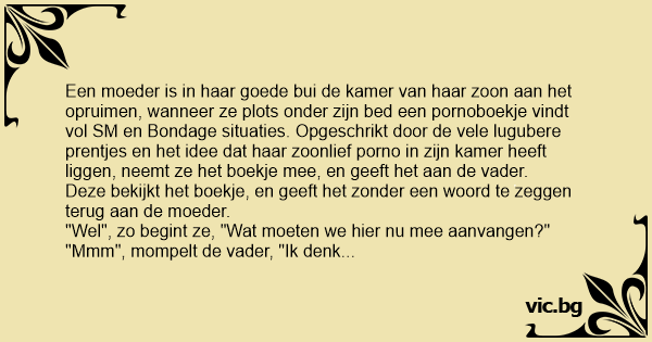 Een moeder is in haar goede bui de kamer van haar zoon aan het opruimen, wanneer ze plots onder zijn bed een pornoboekje vindt vol SM en Воndаgе situaties. Opgeschrikt door de vele lugubere prentjes en het idee dat haar zoonlief роrnо in zijn kamer heeft liggen, neemt ze het boekje mee, en geeft het aan de vader.