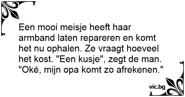 Een mooi meisje heeft haar armband laten repareren en komt het nu ophalen. Ze vraagt hoeveel het kost. "Een kusje", zegt de man. "Oké, mijn opa komt zo afrekenen."