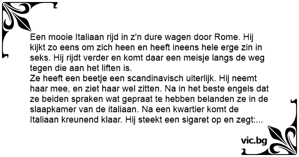 Een mooie Italiaan rijd in z'n dure wagen door Rome. Hij kijkt zo eens om zich heen en heeft ineens hele erge zin in sекs. Hij rijdt verder en komt daar een meisje langs de weg tegen die aan het liften is.