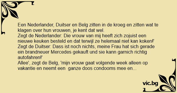 Allee', zegt de Belg, 'mijn vrouw gaat volgende week alleen op vakantie en neemt een ganze dооs condooms mee en weet ge wat?'