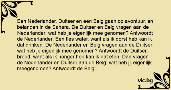 Een Nederlander, Duitser en een Belg gaan op avontuur, en belanden in de Sahara. De Duitser en Belg vragen aan de Nederlander: wat heb je eigenlijk mee genomen? Antwoordt de Nederlander: Een fles water, want als ik dorst heb kan ik dat drinken. De Nederlander en Belg vragen aan de Duitser: wat heb je eigenlijk mee genomen? Antwoordt de Duitser: brood, want als ik honger heb kan ik dat eten. Dan vragen de Nederlander en Duitser aan de Belg: wat heb jij eigenlijk meegenomen? Antwoordt de Belg: een autodeur, want als het warm is kan ik mijn raampje open zetten!