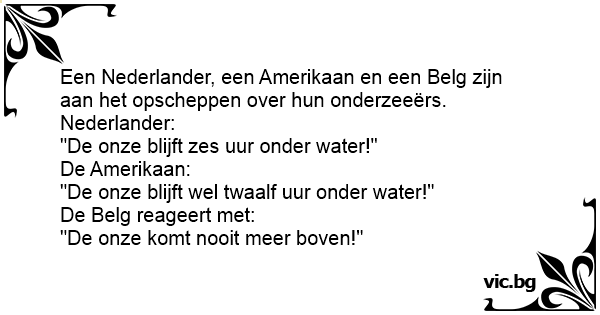 Een Nederlander, een Amerikaan en een Belg zijn aan het opscheppen over hun onderzeeërs. Nederlander: