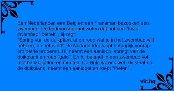"Spring van de duikplank af en roep wat je in het zwembad wilt hebben, en het is er!" De Nederlander loopt natuurlijk voorop om het te proberen. Hij neemt een aanloop, springt van de duikplank en roep "geld". En hij belandt in een zwembad vol met bankbiljetten en munten. De Belg wil ook wel. Hij staat op de duikplank, neemt een aanloopt en roept "frieten". En hij belandt in een zwembad vol met frieten, inclusief mayonaise. Dan is de Fransman aan de beurt. Die klimt op de duikplank, neemt een aanloop, glijdt per ongeluk uit en roept "меrdе!!!"