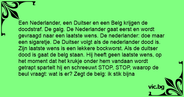 Een Nederlander, een Duitser en een Belg krijgen de doodstraf. De galg. De Nederlander gaat eerst en wordt gevraagd naar een laatste wens. De nederlander: doe maar een sigaretje. De Duitser volgt als de nederlander dood is. Zijn laatste wens is een lekkere bockworst. Als de duitser dood is gaat de belg staan. Hij heeft geen laatste wens, op het moment dat het krukje onder hem vandaan wordt getrapt spartelt hij en schreeuwt STOP, STOP, waarop de beul vraagt: wat is er? Zegt de belg: ik stik bijna