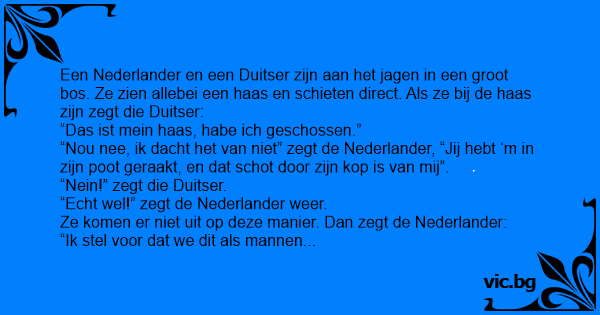 Een Nederlander en een Duitser zijn aan het jagen in een groot bos. Ze zien allebei een haas en schieten direct. Als ze bij de haas zijn zegt die Duitser: