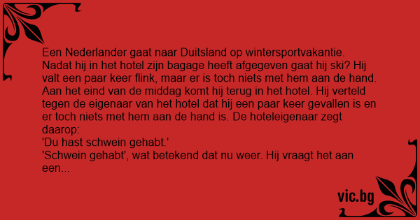 Een Nederlander gaat naar Duitsland op wintersportvakantie. Nadat hij in het hotel zijn bagage heeft afgegeven gaat hij ski? Hij valt een paar keer flink, maar er is toch niets met hem aan de hand. Aan het eind van de middag komt hij terug in het hotel. Hij verteld tegen de eigenaar van het hotel dat hij een paar keer gevallen is en er toch niets met hem aan de hand is. De hoteleigenaar zegt daarop: