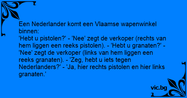 'Hebt u pistolen?' - 'Nee' zegt de verkoper (rechts van hem liggen een reeks pistolen). - 'Hebt u granaten?' - 'Nee' zegt de verkoper (links van hem liggen een reeks granaten). - 'Zeg, hebt u iets tegen Nederlanders?' - 'Ja, hier rechts pistolen en hier links granaten.'