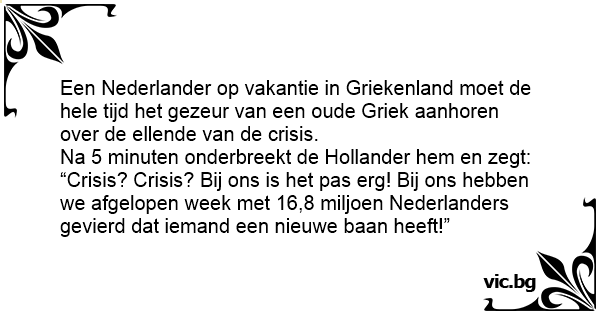 Een Nederlander op vakantie in Griekenland moet de hele tijd het gezeur van een oude Griek aanhoren over de ellende van de crisis. Na 5 minuten onderbreekt de Hollander hem en zegt: “Crisis? Crisis? Bij ons is het pas erg! Bij ons hebben we afgelopen week met 16,8 miljoen Nederlanders gevierd dat iemand een nieuwe baan heeft!”