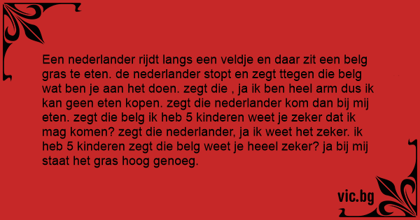 Een nederlander rijdt langs een veldje en daar zit een belg gras te eten. de nederlander stopt en zegt ttegen die belg wat ben je aan het doen. zegt die , ja ik ben heel arm dus ik kan geen eten kopen. zegt die nederlander kom dan bij mij eten. zegt die belg ik heb 5 kinderen weet je zeker dat ik mag komen? zegt die nederlander, ja ik weet het zeker. ik heb 5 kinderen zegt die belg weet je heeel zeker? ja bij mij staat het gras hoog genoeg.