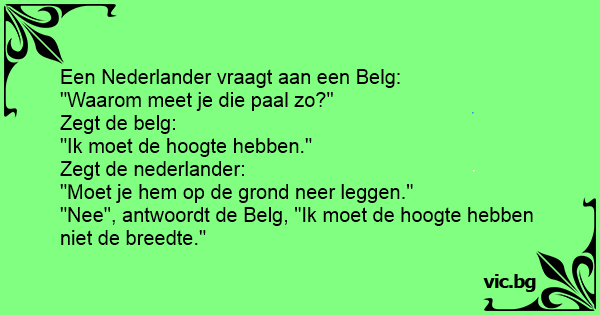 "Nee", antwoordt de Belg, "Ik moet de hoogte hebben niet de breedte."