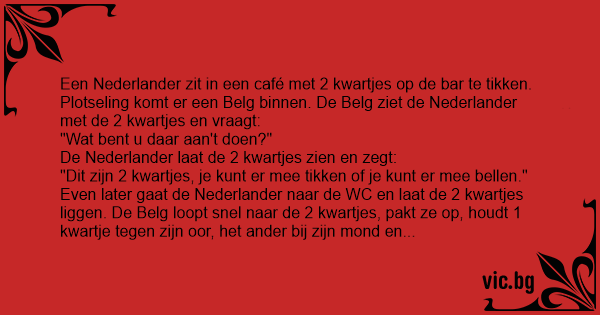 Een Nederlander zit in een café met 2 kwartjes op de bar te tikken. Plotseling komt er een Belg binnen. De Belg ziet de Nederlander met de 2 kwartjes en vraagt: