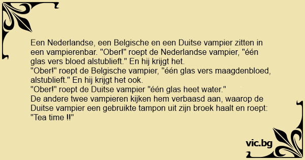 Βρυκόλακες Το τσάι Трима вампири сядат в кафене. Trois vampires se retrouvent à un bar. Le premier commande un verre de sang chaud. Le deuxième commande un verre de sang froid. Le troisième commande un verre d'eau chaude. Les deux autres le regardent tout étonnés. Dracula entre dans un bar de vampires et demande au serveur : C'est trois vampires qui sont dans un bar. Le premier vampire commande un verre de sang chaud.Le deuxième commande un verre de sang froid. Le troisième commande un verre d'eau chaude! Les deux autres le regardent et lui pose la question : - Pourquoi un verre d'eau chaude ? Le troisième répond -... Един ден двама вампири влезли в бар. Първият казал: - Чаша топла кръв, ако обичате. - Веднага - отвърнал барманът. - А вие? - Чаша гореща вода - обадил се вторият вампир. След няколко минути барманът се върнал с чаша топла кръв и гореща вода и казал: - Вие сте вампири, нали? Щом пиете кръв...... Eine Vampirdame setzt sich an eine Bar und sagt zu dem Barkeeper: "Ich hätte gerne eine Tasse mit heißem Wasser." Der Barkeeper fragt erstaunt: "Wieso wollen sie denn Wasser? Sie sollten lieber... Drei Vampire treffen sich in einer Bar. Einer kommt aus Deutschland, einer aus Russland und einer aus England. Der Deutsche bestellt sich ein Bier mit ’nem Schuss Blut und der Russe einen Wodka mit... Ein Vampir geht in eine Bar und bestellt sich ein heißes Glas Wasser.Da fragt der Wirt neugierig: "Hmm, warum wollen sie heißes Wasser und kein Blut?" Da holt der Vampir einen blutigen Tampon... Sitzt ein Eglischer Vampir in einem Kaffe und bestellt eine Tasse heißes Wasser holt einen benutzten Tampong aus der Tasche und sagt genüslich i’ts Tea Time Zwei Vampire gehen in ein Restaurant. Der Eine bestellt sich eine Schale Blut, der andere nur ein Glas heißes Wasser. Daraufhin der Eine zum Anderen: „Wieso bestellst du nur ein Glas heißes... A vampire goes into to the bar and and for a glass of hot water. The bartender says, "I thought you guys only drank blood." The vampire pulls out a used tampon and says, "We do, I'm making tea." Van tres vampiros a un bar a tomarse algo en pleno mes de agosto, va el primero y le dice al camarero: - ¡Camarero!, ponme un vaso de granizado de sangre que me muero de calor. El segundo le dice:... The bartender looks a little worried, but asks him what would he like. "A cup of boiled water please" "Water? I thought you guys drank blood" "Today I was in the mood for tea", says the vampire... There was a vampire who walked into a vampire bar and asked the bartender for a glass of hot water. The bartender asked what for, because everyone else was drinking blood. The vampire pulled out... Trzy wampiry wchodzą do baru. Pierwszy z nich siada, a barman pyta: - Czego sobie życzysz? - Setę krwi! Drugi wampir siada, barman pyta: - A co dla Ciebie? - Dwie kolejki! Trzeci siada, barman... 3 vampires se retrouvent dans un bar lugubre, en hiver, il fait froid.... Le premier demande: - "Un grand verre de sang bien chaud, s'il vous plaît!" le deuxième demande: - "un grand verre de sang... Kolme vampyyriä meni baariin. Ensimmäinen tilasi pienen lasillisen verta, toinen tilasi ison lasin verta. Kolmas vampyyri pyysi kupillisen kuumaa vettä. Kaksi muuta vampyyriä ihmettelivät asiaa ja... 3 vampires walk into a bar. The first one orders a Bloody Mary. The second orders a Bloody Mary. The bartender turns to the third and asks “a Bloody Mary?” The vampire shakes his head. “Hot water... 3 vampieren stappen een caf� binnen. De eerste vampier bestelt een glaasje A negatief en hij drinkt het op. De tweede bestelt een glaasje O negatief opgewarmd. De derde bestelt een glaasje kokend... A vampire walks into a bar, sits down, and says to the bartender, "A cup of boiling water, please." The bartender, confused and scared, walks up with the water and says, "I thought vampires drank... Alcuni vampiri stanno bevendo un drink al loro bar. Entra Dracula e chiede al barista: “Una tazza di acqua bollente”. Il barista e gli altri vampiri lo guardano male. Allora lui tira fuori un...