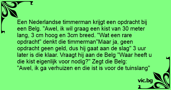 Een Nederlandse timmerman krijgt een opdracht bij een Belg. "Awel, ik wil graag een kist van 30 meter lang, 3 cm hoog en 3cm breed. "Wat een rare opdracht" denkt die timmerman"Maar ja, geen opdracht geen geld, dus hij gaat aan de slаg" 3 uur later is die klaar. Vraagt hij aan de Belg "Waar heeft u die kist eigenlijk voor nodig?" Zegt die Belg: