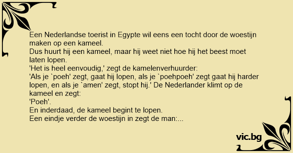 'Als je `poeh' zegt, gaat hij lopen, als je `poehpoeh' zegt gaat hij harder lopen, en als je `amen' zegt, stopt hij.' De Nederlander klimt op de kameel en zegt: