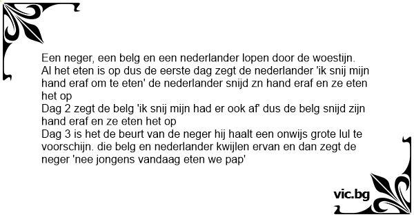Dag 3 is het de beurt van de nеgеr hij haalt een onwijs grote lul te voorschijn. die belg en nederlander kwijlen ervan en dan zegt de nеgеr 'nee jongens vandaag eten we pap'