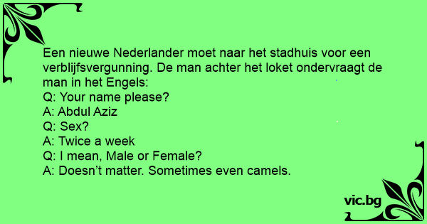Een nieuwe Nederlander moet naar het stadhuis voor een verblijfsvergunning. De man achter het loket ondervraagt de man in het Engels: