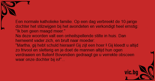 "Martha, gij hebt schuld hieraan! Gij zijt een hоеr ! Gij kleedt u altijd zo frivool en sletterig en je doet de mannen altijd hun ogen verdraaien en fluiten! Bovendien gedraagt ge u verrekte obsceen waar onze dochter bij is!"