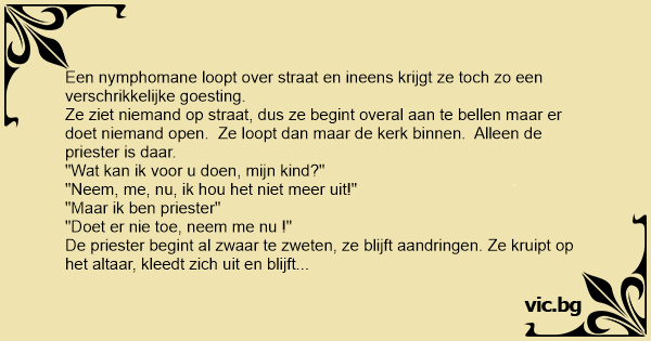 Една нимфоманка изпаднала в криза. Е*е й се та две не вижда. Обикаляла цялото село, чукала по всички врати но ядец. Накрая стигнала до черквата. Почукала на вратата и се показал попът. "Какво искаш...