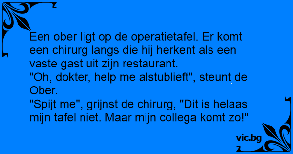 "Spijt me", grijnst de chirurg, "Dit is helaas mijn tafel niet. Maar mijn collega komt zo!"