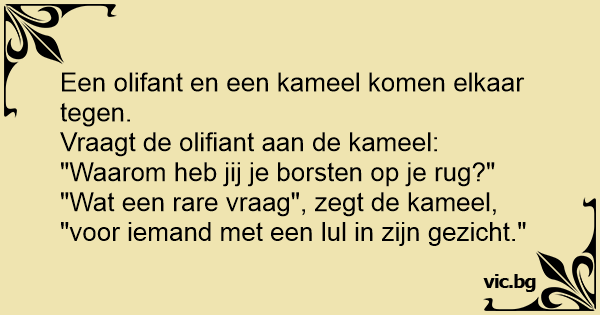 Een olifant komt een kameel tegen en vraagt “Waarom heb jij borsten op je rug?” Zegt de kameel “Wat een aparte vraag voor iemand die een lul aan zijn gezicht heeft hangen.”