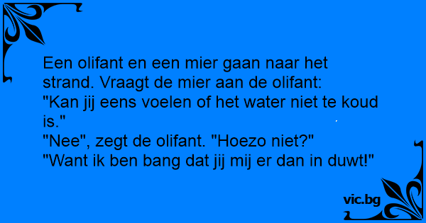 Een olifant en een mier gaan naar het strand. Vraagt de mier aan de olifant: