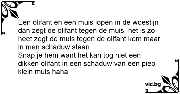 Een olifant en een muis lopen in de woestijn dan zegt de olifant tegen de muis het is zo heet zegt de muis tegen de olifant kom maar in men schaduw staan