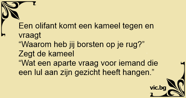 De olifant vraag aan de kameel: "Waarom staan uw tetten op uw rug?" De kameel antwoordt: "Dat vind ik een stomme vraag als ge rondloopt met een lul op uw bakkes!"
