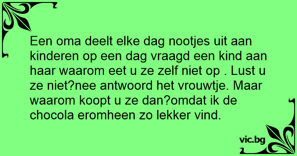 Een oma deelt elke dag nootjes uit aan kinderen op een dag vraagd een kind aan haar waarom eet u ze zelf niet op . Lusт u ze niet?nee antwoord het vrouwtje. Maar waarom koopt u ze dan?omdat ik de chocola eromheen zo lekker vind.