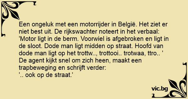 Een ongeluk met een motorrijder in België. Het ziet er niet best uit. De rijkswachter noteert in het verbaal: