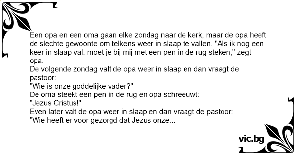 Een opa en een oma gaan elke zondag naar de kerk, maar de opa heeft de slechte gewoonte om telkens weer in slaap te vallen. "Als ik nog een keer in slaap val, moet je bij mij met een pen in de rug steken," zegt opa.
