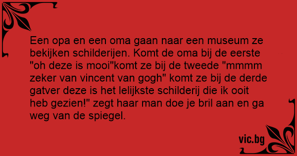 Een opa en een oma gaan naar een museum ze bekijken schilderijen. Komt de oma bij de eerste "oh deze is mooi"komt ze bij de tweede "mmmm zeker van vincent van gogh" komt ze bij de derde gatver deze is het lelijkste schilderij die ik ooit heb gezien!" zegt haar man doe je bril aan en ga weg van de spiegel.