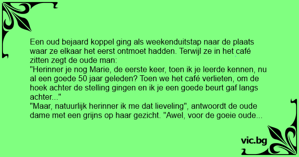 "Maar, natuurlijk herinner ik me dat lieveling", antwoordt de oude dame met een grijns op haar gezicht. "Awel, voor de goeie oude tijd, laten we nog eens naar daar gaan, dan geef ik je nog eens een beurt langs achter" zegt de oude man.