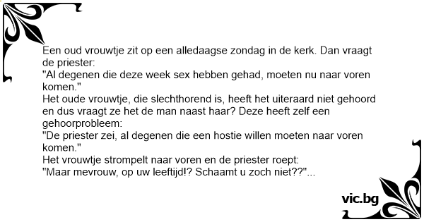 Een oud vrouwtje zit op een alledaagse zondag in de kerk. Dan vraagt de priester: