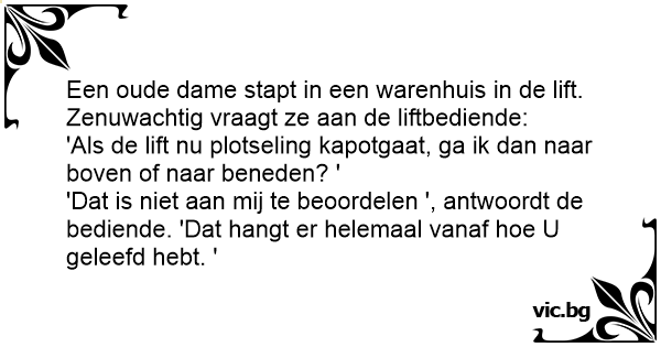 Een oude dame stapt in een warenhuis in de lift. Zenuwachtig vraagt ze aan de liftbediende: