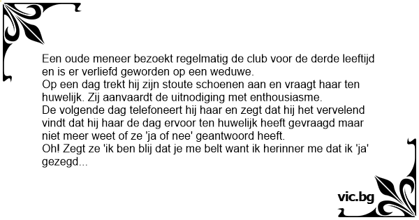Een oude meneer bezoekt regelmatig de club voor de derde leeftijd en is er verliefd geworden op een weduwe.