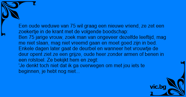 Eine 73-jährige Witwe gibt eine Kontaktanzeige auf: "Suche Mann, 60 bis 75 Jahre, soll mich nicht schlagen, nicht treten und es mir gut besorgen können." Drei Tage später klingelt es an der Tür. Sie macht auf und sieht einen Mann ohne Arme und Beine vor der Tür. Sie fragt: "Was wollen sie hier?"...