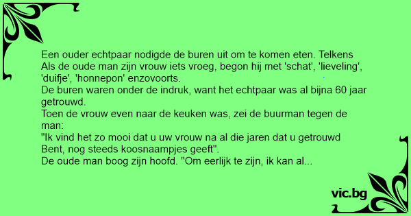 Als de oude man zijn vrouw iets vroeg, begon hij met 'schat', 'lieveling', 'duifje', 'honnepon' enzovoorts.