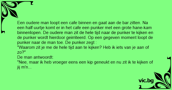 Een oudere man loopt een cafe binnen en gaat aan de bar zitten. Na een half uurtje komt er in het cafe een punker met een grote hane-kam binnenlopen. De oudere man zit de hele tijd naar de punker te kijken en de punker wordt hierdoor geirriteerd. Op een gegeven moment loopt de punker naar de man toe. De punker zegt :