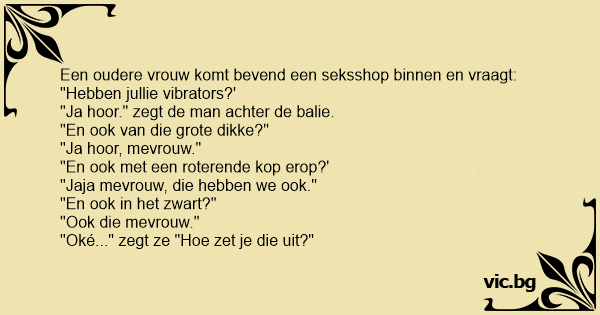Een oudere vrouw komt bevend een seksshop binnen en vraagt:
